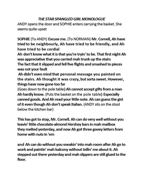 Star Spangled Girl Full Script Ebook Kindle Editon By Click Button. Star Spangled Girl Full Script Ebook it’s easy to recommend a new book category such as Novel, journal, comic, magazin, ect. You see it and you just know that the designer is also an author and understands the challenges involved with having a good book. You can easy klick for detailing book and you can read it online, even you can download it